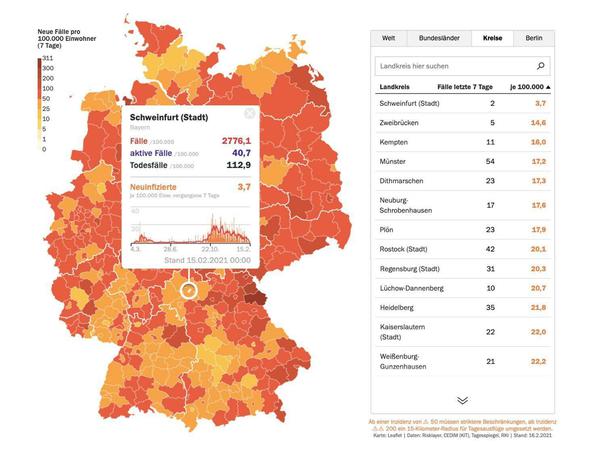 Die Kreisfreie Stadt Schweinfurt in Bayern hat derzeit die mit Abstand niedrigste Sieben-Tage-Inzidenz in der Corona-Pandemie. Tagesspiegel-Zahlen zufolge liegt sie am Dienstag (Stand 12 Uhr) bei 3,7 Fällen pro 100.000 Einwohner. In den vergangenen sieben Tagen gab es nur zwei Neuinfektionen in Schweinfurt. Wir haben mit Oberbürgermeister Sebastian Remelé (CSU), 52, über die Gründe gesprochen.
