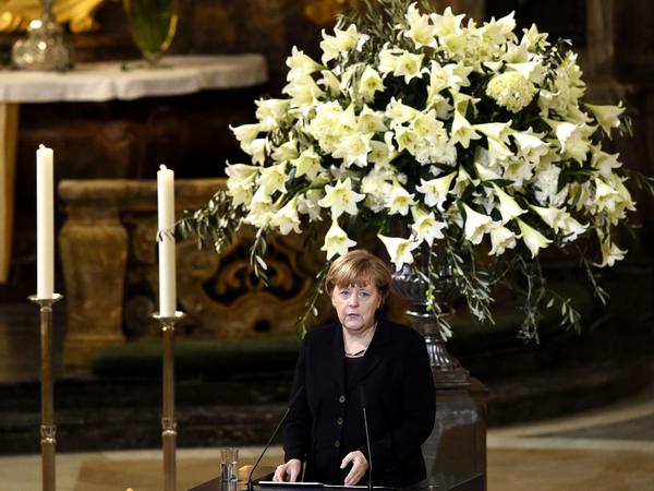 Merkel würdigt Durchsetzungsstärke: "Er war wirklich nicht immer einfach und freundlich im Umgang", sagt die Kanzlerin über Schmidt. "Aber, und das zählt, er war bereit, stets den höchsten Preis zu bezahlen." Gegen teils erhebliche Widerstände habe sich Schmidt etwa für den Nato-Doppelbeschluss - die Aufstellung von Mittelstreckenraketen in Westeuropa - eingesetzt. Sein Mut, für eigene Überzeugungen einzustehen, hätten Schmidt Achtung und Respekt bis heute eingebracht. "Er war standhaft." Merkel bescheinigt dem Altkanzler zudem "nüchternen Pragmatismus" und eine "Resistenz vor ideologischer Einengung". Und sie erinnert an seinen Satz "Wer Visionen hat, soll zum Arzt gehen". Den hatte Schmidt später selbst so eingeordnet: "Eine pampige Antwort auf eine dusselige Frage." Die Kanzlerin beendet ihre Rede mit den Worten: "Ich verneige mich vor einer herausragenden Persönlichkeit. Lieber Helmut Schmidt, Sie werden uns fehlen."