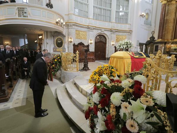 Scholz erinnert an Herzlichkeit. Olaf Scholz betont die Herzlichkeit, die auch Schmidts bereits verstorbene Frau Loki, ausgestrahlt habe. Außerdem seine Liebe zur Hansestadt Hamburg. Schmidt selbst bleibe "Fixstern" der Politik. "Er hat Spuren hinterlassen, die wir erst noch entdecken werden." Er sagt weiter: "Wir haben einen Giganten verloren." Dann verneigt sich Scholz vor dem Sarg.