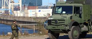 Rund 500 Soldaten simulieren am Hamburger Hafen eine Truppenverlegung in die baltischen Staaten. Im Nato-Bündnisfall würde Deutschland zur „zentralen europäischen Drehscheibe“.