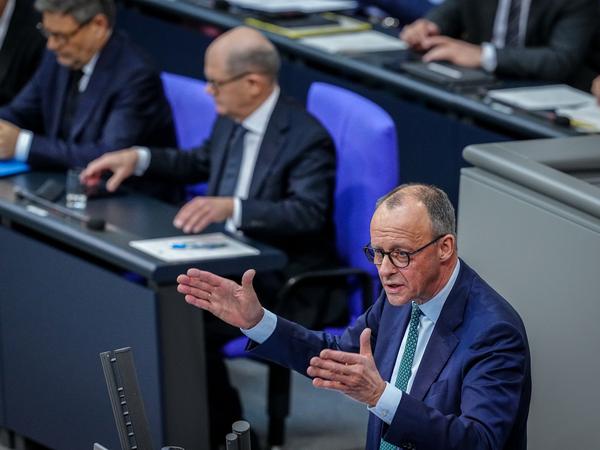 Oppositionschef Merz folgt auf den Kanzler und beginnt seine Rede mit einer Reaktion auf Scholz. „Was war das denn?“, fragt er fassungslos. Der Kanzler habe nur 25 Minuten abgelesene Empörung über den Oppositionsführer zu bieten gehabt. „Sie verwandeln den Plenarsaal des Deutschen Bundestages in einen Juso-Bundeskongress? Ist das allen Ernstes das, was Sie zum Abschluss dieser drei Jahre hier vortragen?“, fragt Merz.