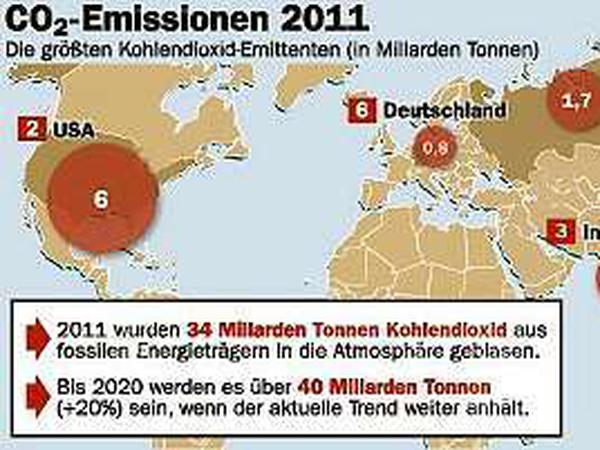 2011 haben die globalen Kohlendioxidemissionen einen neuen Rekordwert erreicht, der Trend setzt sich auch in diesem Jahr fort. Zwar sind die CO2-Emissionen in Europa, in Osteuropa und sogar in den USA gesunken. Doch in den schnell wachsenden Schwellenländern von Brasilien bis Indien steigt der Treibhausgasausstoß in einem nie da gewesenen Tempo. China hat die USA schon vor drei Jahren als größter CO2-Emittent überholt. Beim Pro-Kopf-Ausstoß ist Chinas Wert mit inzwischen vier Tonnen pro Kopf und Jahr etwa doppelt so hoch, wie es für das Zwei-Grad-Ziel noch verträglich wäre. Und damit liegt es immer noch deutlich unter den 19 Tonnen pro Kopf in den USA und den rund zehn Tonnen in der EU. In den USA ist der Treibhausgasausstoß deshalb gesunken, weil billiges heimisches Schiefergas nach und nach die Kohle bei der Stromerzeugung verdrängt. Allerdings werden die Emissionen, die bei der Schiefergasförderung entstehen, nur unzureichend in diese Kalkulationen eingerechnet. Abgesehen davon ist der CO2-Ausstoß in den USA wegen der Rezession nach der Finanzkrise 2008 deutlich gesunken.