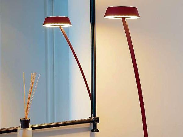 Der Kopf der Leuchte besteht aus Aluminium und ist in sieben Farben lieferbar. Der Clou der Leuchte: Sie ist oben und unten mit LED bestückt, und ihr Kopf lässt sich schwenken. Natürlich kann man das Licht auch dimmen. Aber damit nicht genug: „Glance“ strahlt Licht nach oben und unten ab, der untere Lichtkranz ist dabei natürlich größer als der obere. Er gibt zwei Drittel des Lichtes ab, der kleinere Ring ein Drittel. Der Kopf lässt sich auch abnehmen und umgekehrt wieder aufstecken – so verändert man die Verteilung des Lichts. Darüberhinaus kann man den oberen und unteren Lichtkranz über einen innen liegenden Schalter separat ein- und ausschalten. Dann gibt die Leuchte nur Licht nach oben oder nur nach unten ab oder in beide Richtungen.
