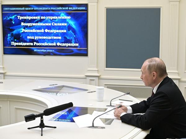 Der russische Präsident Wladimir Putin wohnt einem Bericht der staatlichen Nachrichtenagentur RIA zufolge einem Training der strategischen Atomstreitkräfte bei. Aufgabe der Einheit ist es unter anderem, auf eine Bedrohung durch einen atomaren Angriff zu reagieren.