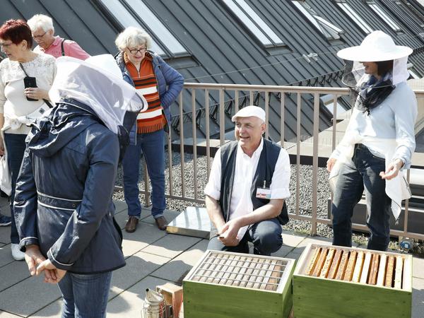 Die Bürger konnten etwa den Plenarsaal, das Studio des rbb und in den Fluren die Jahresausstellung mit deutschen und polnischen Druckgrafiken besichtigen. Landesimker Holger Ackermann, der seit 2017 zwei Bienenvölker auf dem Dach der Staatskanzlei betreut, berichtete über die geplante Ansiedlung von Bienenschwärmen auf dem Dach nahe des Fortunaportals in diesem Frühjahr, die im Herbst den ersten "Parlamentshonig" liefern sollen. (dpa)