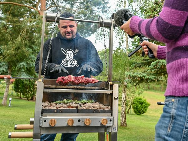 Hohenwutzen - Routiniert hält Klaus Glaetzner ein großes Stück Tafelspitz in die Höhe. „Der geht auch lecker, ohne Meerrettichsoße, dafür am Spieß, so wie es die Brasilianer traditionell tun“, sagt der 46-Jährige und schaut dabei in die Videokamera, die seine Frau bedient. „Lasst die Kohle gut durchglühen und legt frische Rosmarin-Zweige für das besondere Aroma in die Glut“, rät der Grillfluencer aus Brandenburg den Zuschauern.