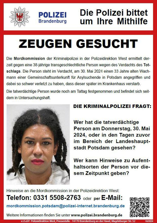 Eine transgeschlechtliche Person steht unter Verdacht, Ende Mai in Potsdam einen Wachmann einer Flüchtlingsunterkunft angegriffen und tödlich verletzt zu haben. Nachdem die 38 Jahre alte Person am 30. Mai in Berlin festgenommen wurde, richtet sich die Polizei nach einem Beschluss des Amtsgerichts nun mit Fahndungsplakaten an die Öffentlichkeit. Auf den Plakaten, die in Potsdam angebracht werden, ist das Gesicht der Person abgebildet.