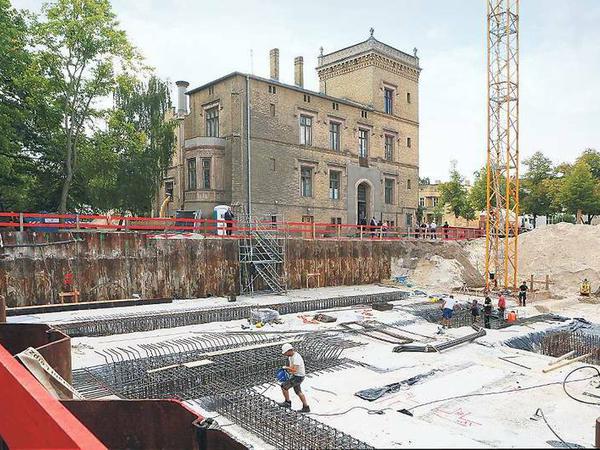 Die Bauarbeiten auf dem Areal am Tiefen See gehen unterdessen voran. Die Villa sei im Inneren auf das Niveau zurückgebaut, das unter Gesichtspunkten des Denkmalschutzes zu erhalten sei, so Projektleiter Tim Kley. „Wir liegen im Zeitplan.“ Allerdings sei das Gebäude durch den langen Leerstand in sehr schlechtem Zustand. Im Obergeschoss sind Wasserschäden deutlich zu erkennen. Im Dachgeschoss gebe es Schwamm, so Kley.