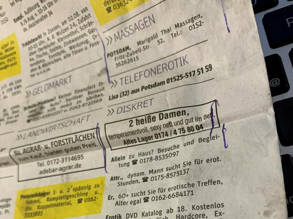 In diesem März aber begann die finsterste Zeit für die Potsdamer Prostituierten. Die Zahl der Corona-Infektionen stieg rapide, auch Sexarbeit wurde verboten. Im Schattenreich des Milieus scheuten Luden, Prostituierte und Freier zunächst das Licht, bevor zaghaft der Neustart begann. In Babelsberg ließ sich plötzlich wieder „JennyKaetzchen” zum Stundensatz von 100 Euro buchen, im Zentrum hielt sich „Little_Tinkerbell” bereit (Haarfarbe: Blond. Alter: 28. Größe: 1,58. Gewicht: 57. Körbchengröße: E.).