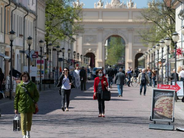 Am ersten Wochenende nach der Ladenöffnung war die Brandenburger Straße in der Potsdamer Innenstadt am Samstag gut besucht. In vielen Geschäften sahen sich Kunden um, es gab aber keinen regelrechten Ansturm.
