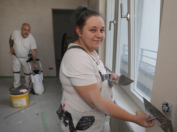 Und trotzdem muss es perfekt sein - auch die Wand, die später hinter der Küchenzeile verschwinden wird. Lisa-Sofie Lux glättet und schleift von Hand. Bei größeren Flächen kommen Maschinen zum Einsatz. Staubig ist es hier überall. Atemwegserkrankungen und Allergien gehören zu den Berufskrankheiten des Malers. Die 20-Jährige wollte trotzdem diesen Beruf lernen. "Ich wollte etwas auf dem Bau machen", sagt sie, und jetzt ist sie die einzige Frau in ihrer Berufsschulklasse - und auf der Potsdamer Baustelle, wo Trockenbauer, Fliesenleger und Elektriker miteinander auskommen müssen.