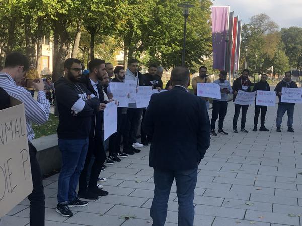 Mit einer Kundgebung protestierte eine Gruppe am Mittwoch zu Beginn der Stadtverordnetenversammlung vor der MBS-Arena gegen die Arbeit der Einbürgerungsbehörde in Potsdam. Auf den Pappschildern der etwa 15 überwiegend junger Männer forderten sie unter anderem eine schnellere Bearbeitung der Anträge. „Schnelle Bearbeitung statt Leben in der Warteschleife“, war dort zu lesen, oder „Bearbeitungsdauer ein Jahr, nein Danke“. Mit dabei waren auch Aktivisten des linken Bündnisses „Stadt für alle“. Seit Jahren steht bereits schon die Ausländerbehörde in Potsdam in der Kritik wegen zu langer Bearbeitungszeiten. (sca/HK)