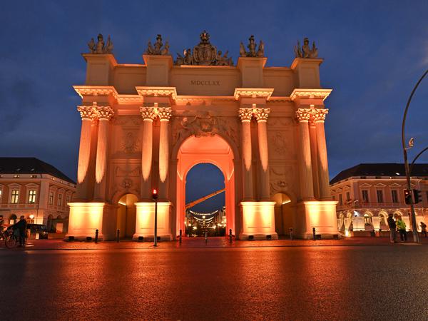 Bis zum 1. Advent am 30. November ist es zwar noch etwas mehr als eine Woche hin, aber Potsdam verströmt bereits Weihnachtsstimmung. Der Aufbau für den neuen Weihnachtsmarkt ist längst in vollem Gange, die Buden stehen – und in den Abendstunden funkelt es in der Innenstadt dank Lichterketten, Weihnachtskugeln und Weihnachtssternen. Natürlich fehlt auch ein großer Weihnachtsbaum vor dem Brandenburger Tor nicht. Ein weiteres Highlight ist das in rotes Licht getauchte Brandenburger Tor.
