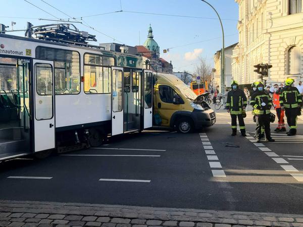 Der 22 Jahre alte Fahrer des Kleintransporters, der Straßenbahnfahrer (58) und die rund 20 Fahrgäste blieben unverletzt. Das teilte die Polizei am Mittwoch mit. Die Tram war nach Angaben von Stadtwerke-Sprecher Stefan Klotz mit dem ersten Drehgestell entgleist.