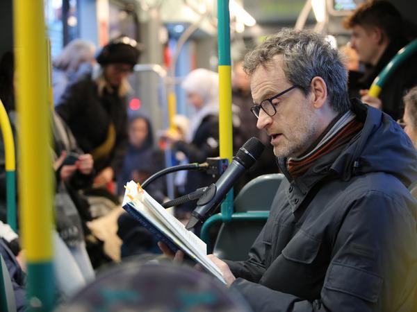 Vorlesetag in Potsdam: Tatort-Star Jörg Hartmann überrascht Tram-Fahrgäste mit Geschichten