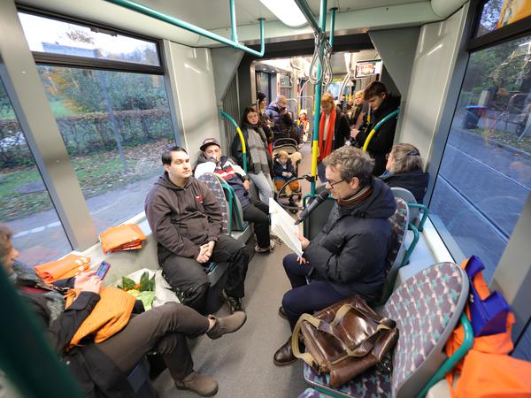 Wer am Freitagnachmittag mit der Tram 96 fuhr, konnte Geschichten lauschen. Volkshochschule, Grundbildungszentrum und ViP hatten bekannte Potsdamer zum Vorlesen geladen.