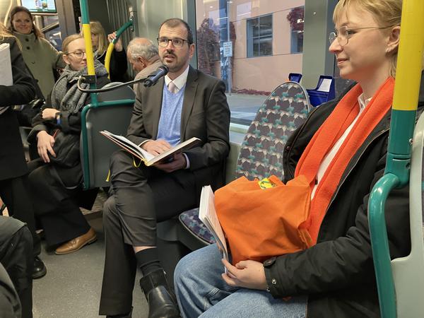 Für die meisten Fahrgäste ist es eine unerwartete Unterbrechung im Feierabendverkehr. Ein kleiner Junge hört kurz zu, dann widmet er sich wieder seinem Handyspiel. Manche Fahrgäste scrollen durch ihre Smartphones, hören Musik, scheinen die Lesung trotz aufgebauter Lautsprecher kaum mitzubekommen. Andere wiederum treten bewusst dichter oder sind extra zugestiegen, wie Lena Thoning.