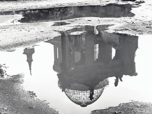 Vielleicht ist es der französische Einfluss, dass Potsdams Stadtkanal bei Arwid Lagenpusch tatsächlich aussehen kann wie die Seine. Andere Bilder erinnern in ihrem starken Gespür für Licht und Schatten, in der detailgenauen Bildkomposition, an Werke von Max Baur. Da spiegelt sich in einer Pfütze zwischen Pflasterstein und sandigem Weg die Ruine eine zerbombten Fassade: Durch deren Fenster sieht man den Himmel.