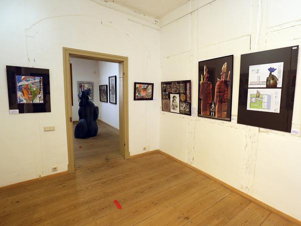 Manfred Rößler, der nach seinem Kunststudium zehn Jahre an der Fachhochschule für Angewandte Kunst Berlin-Potsdam unterrichtete, findet nicht nur im Steinzeug, sondern auch in der collagenhaften Grafik und in der Zartheit des Aquarells sein Podium. Wir schauen in wilde, ungestüme Gesichter, in sich zurückgezogene, aufgeschreckte Antlitze. Bei manchen stockt der Atem. Der Grafiker bleibt in der Farbe, auch wenn es düster wird. Wie bei seinem „Freund Ingo A.“, der hinter einem schwarzen Gitternetz hervorlugt, mit stechendem Blick aus einer entrückten Welt. Oder bei der „Geschundenen Kreatur“, in der ein kräftiges schwarzes Pferd fast zu Boden geht.
