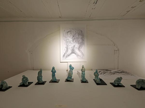 Mittig treffen sie auf Rapunzel Bräutigams Arbeiten. Neben ihren Aquarellen, Tuschezeichnungen und Drucken durchzieht Bräutigams Keramik die Ausstellung und setzt den Menschen in Beziehung zu den Bäumen. Ihre „Lebensstufen“-Serie aus blasstürkiser Krakelee-Keramik beispielsweise zeigt, wie im Tanz, Werden und Vergehen des Menschen.