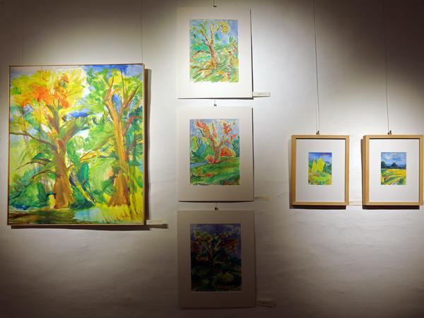 In der Diele des historischen Museumshauses hängen Aquarelle von Bettina Hünicke in erdigen, gedeckten Farben. Hünickes kraftvolle Ölmalereien „Begegnung“ und „Frieden“ mit ihren leuchtenden Farben und dynamischen Pinselstrichen durchbrechen die gedeckte Stimmung wie gleißende Erinnerungen an den Sommer – beinahe meint man, die Blätter rauschen zu hören.