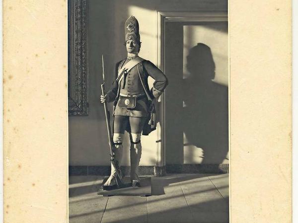 „Licht ist für mich alles“, soll Max Baur gesagt haben, und auch die 14 in der Mappe gezeigten Arbeiten bezeugen das. Das auf Seidenstoff gestickte Wappen des Ersten Garderegiments zu Fuß schimmert so plastisch, dass man sich hineinkuscheln will. Der Lange Kerl, der im Fenster des ehemaligen Marstalls steht, wird von seinem Schatten bewacht, geradezu bedroht – was dem Foto eine höchst künstlerische, fast jenseitige Komponente gibt. Baur, der für seine feinstens komponierten Außenaufnahmen berühmt ist, zeigt hier, dass er auch bei Innenaufnahmen die gleiche Geduld, die gleiche Akribie aufbrachte. Er, der sich Lichtbildner nannte, soll oft stundenlang aufs richtige Licht gewartet haben. Zufall gibt es bei ihm nicht.