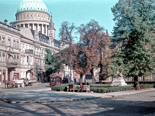 Auf dem Steubenplatz hält ein Bierkutscher der Kindl-Brauerei, die Flaschenkästen gefährlich getürmt. Der Alte Markt ist Kreuzung, und parken darf man hier auch. Vereinzelt sieht man Polizisten, aber kaum etwas, das auf die Nazizeit deutet. „Im Vergleich zu Berlin gibt es von Potsdam erstaunlich wenige Bilder mit politischen Symbolen wie Flaggen“, sagt Sobotta, „als hätten die Leute versucht, das zu vermeiden.“