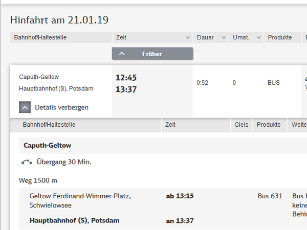 In Caputh würden die Ersatzbusse auch an der Schule halten, nahe der Fähre. Das ist laut Bahnsprecher ein Ersatz für den Wegfall des Geltower Haltes. Zwar beträgt der direkte Weg zwischen der Haltestelle in Caputh und dem Geltower Bahnhof tatsächlich „nur“ einen Kilometer. Allerdings müssten Pendler dafür die Seilfähre nutzen, sodass der Weg so lange dauern würde, dass selbst die Webseite der Bahn diese Variante gar nicht erst anzeigt. Sie empfiehlt stattdessen den 1,5 Kilometer langen Fußweg in den Geltower Ortskern, um dort Linienbusse zu nutzen.