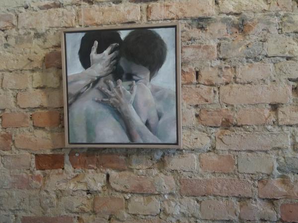 Die Meisterschülerin Helena Zubler zeigt im Gegensatz dazu sehr weltliche, alltägliche Dinge. Ihr großes Thema, das sich durch ihre Arbeiten in Öl zieht, ist der Mensch. Sein Körper, seine Emotionen, seine Interaktionen mit anderen. Ihre Bilder zeigen intime Momente. Pärchen, die sich liebevoll, manchmal, so scheint es, aber auch verzweifelt im Arm halten oder nur ganz zaghaft berühren. Mit Umarmungen hat sich die 26-jährige Zubler in der ersten Hälfte dieses Jahres auseinandergesetzt. Andere, ältere Gemälde zeigen Figuren, die ihren Kopf zwischen den Händen vergraben halten oder ihr Gesicht zwischen den Fingern zerknautschen. „Ich versuche mit meinen Bildern immer Emotionen zu wecken, ohne dem Betrachter dabei etwas vorgeben zu wollen.“ Auf allen Bildern stehen nicht die Gesichter im Fokus, die oft nur angedeutet sind oder komplett fehlen. Das sei eine bewusste Entscheidung, so Zubler. „Wenn ein Körper ein Gesicht hat, hat er eine Identität, wird zu einer individuellen Person. Ohne eine eigene Identität, ist es für den Betrachter leichter, sich mit dem Dargestellten zu identifizieren.“