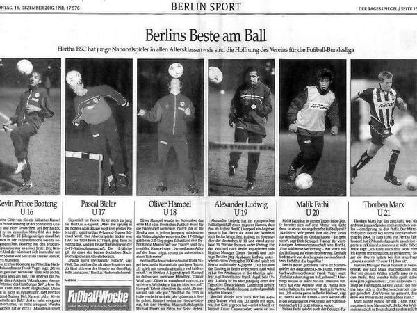 Das Archiv vergisst nie: Im Dezember 2002 stellten wir die besten Juniorennationspieler von Hertha BSC vor. Darunter war auch ein 15 Jahre alter Junge, den kaum jemand kannte. Den Artikel haben wir nun herausgekramt - Boateng tritt ja mit Schalke bei Hertha an.