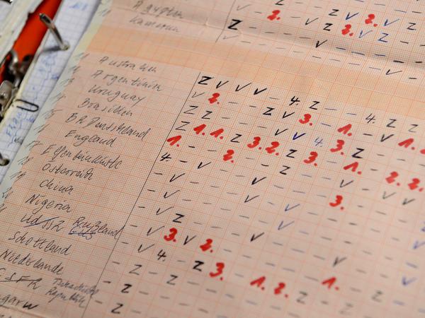 Diese Liebe zum Erstellen von Sportstatistiken mit der Hand hat ihn nie mehr verlassen. Im Laufe der Zeit hat er seine Methode verfeinert. Reiner Bartkowiak setzt seine randlose Lesebrille auf und mustert seine mitgebrachten schweren Ordner. Darin gibt es jede Menge Statistiken zu populären Sportarten wie Handball, Fußball und Hockey, aber eben auch zu anderen wie Rugby oder Curling. Alle mit der Hand angelegt und immer weitergeführt. Er entscheidet sich für einen Ordner, öffnet ihn und entnimmt ihm ein mehrfach gefaltetes Blatt.