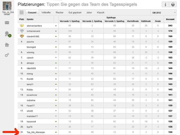 Nein, ganz schlecht ist dieses Ergebnis für uns nicht: Dass bei über 700 Mitspielern der beste Tagesspiegel-Mitarbeiter, Volontär Nik Afanasjew, in unserem offenen "Tippen Sie gegen das Team des Tagesspiegels"-Tippspiels bei tippmeile.de am Ende den 21. Platz belegt hat, ist durchaus achtbar. Dass es mit Taktikexperte Matthias Klappenbach auf Platz 61 und Parlamentskorrespondent (Sic!) Christian Tretbar auf Platz 69 noch zwei weitere Spieler des kleinen Tagesspiegel-Teams in die Top 100 geschafft haben, ist auch gar nicht mal so schlecht.