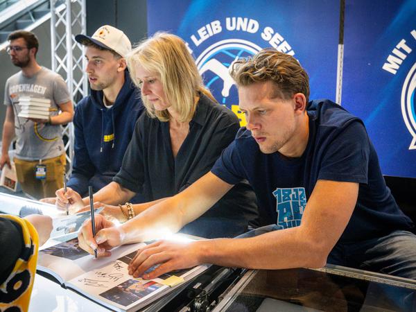Ein Spiel fünf gehört im Basketball zu den absoluten Highlights, am Donnerstag bildeten sich die Warteschlangen lange vor dem Beginn aber nicht am Eingang zu den Tribünen, sondern in der Lobby der Arena in Friedrichshain. Viele Fans nutzten die Gelegenheit, um zwei Berliner Weltmeistern einmal ganz nah zu sein. Franz und Moritz Wagner statten ihrem Heimatverein einen Besuch ab, posierten für Selfies und signierten die von ihrer Mutter Beate geschriebene Biografie.
