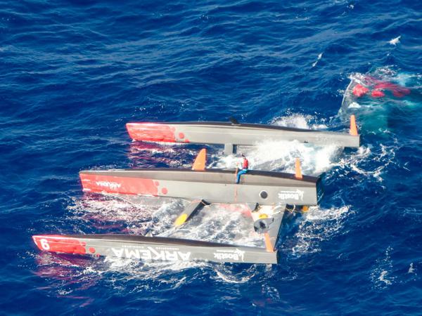 Der 36-jährige Meilhat, der nach einer bravourösen Leistung nun die Spitzengruppe anführt, braucht zehn Stunden ins Ziel. Er segelt mit einem älteren Boot, das keine Foils hat. Dieser Nachteil konnte sich zunächst nicht auswirken, weil die Foils bei dem stürmischen Auftakt ihr Potenzial ohnehin nicht entfalteten. Und schließlich, in der Passatzone, abermals nicht. Jedenfalls fiel Vincent Riou zurück, dessen PRB zwar älteren Datums ist, aber jüngst mit hypermodernen, verstellbaren Foils nachgerüstet wurde.