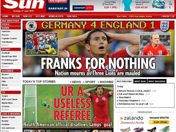 "Nutzlos" sei der Schiedsrichter, kläffte die Boulevardzeitung "The Sun". „England wird von Deutschland bei der WM gedemütigt (mit viel Hilfe des Schiedsrichters aus Uruguay)“, klagte das Massenblatt „Daily Mail“. Von einer „Fan-Wut wegen des Tor-Fehlers“ berichtete die nicht mehr ganz so seriöse „Times“. Natürlich wurde Frank Lampards nicht gegebenes Tor in den englischen Medien diskutiert, aber die schwache Leistung der eigenen Mannschaft war dann doch das wichtigere Thema. „Trostloses England erleidet WM-Herzschmerz“, schrieb der durchaus seriöse „Independent“. Der liberale „Guardian“ hatte eine „schreckliche Schwäche der englischen Abwehr“ gesehen. Und der "Daily Mirror" bezog eindeutig Position gegenüber Trainer Fabio Capello: "FABIGO", titelte das linke Boulevardblatt in fetten schwarz-roten Großbuchstaben. No name jokes, keine Witze mit Namen, die gute alte Journalistenregel gilt auf der Insel schon lange nicht mehr. Und dann griff der "Mirror" sogar ein gutes altes deutsches Namenswortspiel auf: „Three Lions von Deutschland gemüllert - und vom Referee.“