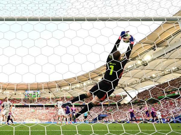Ohne Gegentor war Neuer bei einer EM oder WM schon lange nicht mehr geblieben. Genau gesagt: Zwölf Spiele kassierte Deutschland seither bei vier verschiedenen Turnieren immer mindestens ein Tor. Diese Serie hatte sich auch beim furiosen 5:1 gegen Schottland zum EM-Auftakt durch das späte Eigentor von Antonio Rüdiger fortgesetzt. Die Null stand letztmals im EM-Achtelfinale 2016 beim 3:0 gegen die Slowakei.