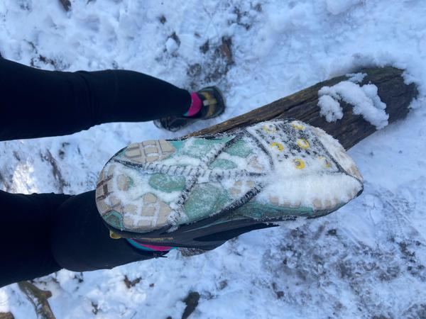 Der Vorteil dieser mit Spikes und Draht bestückten Gummisohlen ist nämlich nicht nur, dass man sicherer läuft, sondern dass man auf Eis und überfrorenem Schnee ein Geräusch verursacht, das an einen schweren Eisbrecher erinnert. So hören mich die Spaziergänger*innen, die in meiner Richtung unterwegs sind, schon aus der Ferne und drehen sich im besten Fall um, sodass wir die Platzverteilung auf engen Wegen gut regeln und sie sich von meinem Winterlächeln anstecken lassen können – sofern das Halstuch meinen Mund nicht bedeckt.