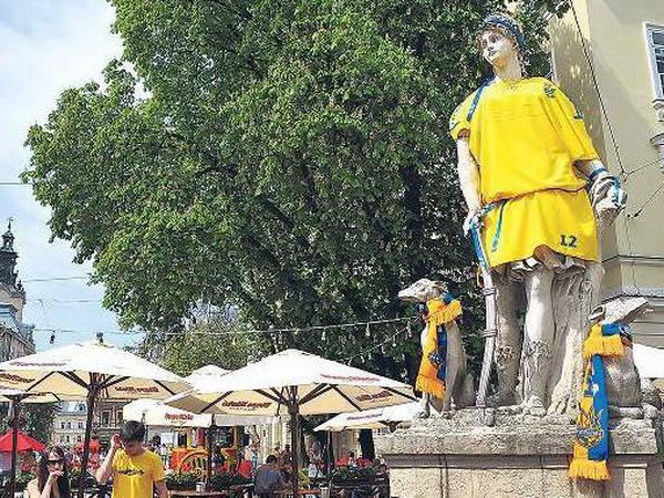 Ohnehin sehen sie sich in Lemberg gern in der kaiserlich-königlichen Tradition und stören sich überhaupt nicht daran, wenn deutsche Touristen statt des für ihre Zungen komplizierten Namens Lwiw eben von Lemberg sprechen. „Das ist unsere Geschichte, darauf sind wir stolz“, sagt der Bürgermeister Andriy Iwanowitsch Sadovyi. Ein unauffälliger und doch volkstümlicher Mann, auch die Volunteers dürfen ihn mit Andriy Iwanowitsch anreden. Für drei EM-Vorrundenspiele hat seine Verwaltung einen neuen Flughafen und ein neues Stadion bauen lassen. Die vier historischen Statuen rund um das Rathaus tragen blau-gelbe Leibchen. Ein bisschen Lokalpatriotismus muss schon sein, auch wenn die ukrainische Mannschaft weit weg in Kiew und Donezk spielt.