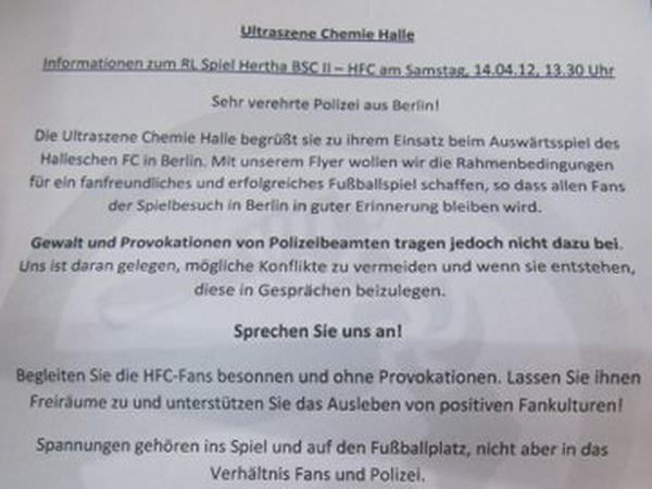 Doch es gibt ja noch die Gegenseite. Am Wochenende tauchten plötzlich 100 Hallenser Ultras mit "Ultras-Konfliktmanagement"-Westen auf und überreichten den Einsatzkräften in Berlin Handzettel mit Informationen und Angeboten für einen entspannten Umgang miteinander. Und siehe: die Berliner Polizei reagierte schlau und listig. Durch ihr kreatives und kommunikatives Einsatzverhalten ermöglichten sie einen störungsfreien Ablauf des Gastpiels der Hallenser Fans in Berlin.