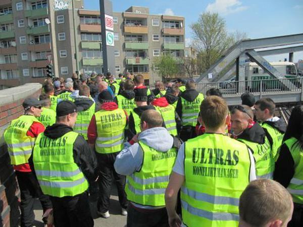 Da alle Lust Ewigkeit will, hat langes Siechtum eines Tages ein Ende. Die Fankultur in Halle hat sich weiter entwickelt, gegen die U-dingsda hatten sich die Ultras etwas Besonderes einfallen lassen. Etwa fünfhundert Hallenser waren mit Bahn oder Auto nach Berlin gerauscht. In den letzten Jahren kam es bei Besuchen der Hallenser häufig zu Konflikten mit der Berliner Polizei. Das ist im Fußball unschöne Begleiterscheinung, sorgt aber andernorts durchaus mal für Nachdenklichkeit. In Städten wie Hannover, Meppen, Magdeburg oder Lübeck sinniert die Polizei gern über den Tellerrand hinaus. Dort stehen nicht nur Polizeibeamte in martialischer Montur als städtisches Empfangskomitee auf dem Bahnhof. Da leistet ein polizeilicher Konfliktmanager gute Arbeit fürs Gemeinwohl. Die Kontaktbeamten sind mit Signalwesten bekleidet und für alle Beteiligten leicht zu erkennen. Sie greifen bei Problemen schnell ein und bieten Lösungen an, wenn beispielsweise Auswärtsfans bei Sicherheitsspielen unbedingt geschlossen in ein Stadion marschieren wollen. Wenn Konfliktmanager von Fans wie Polizeikräften akzeptiert werden, ist das ein großartiges Konzept für die Zukunft. In Berlin ist man von solch neumodischem Kram weit entfernt.