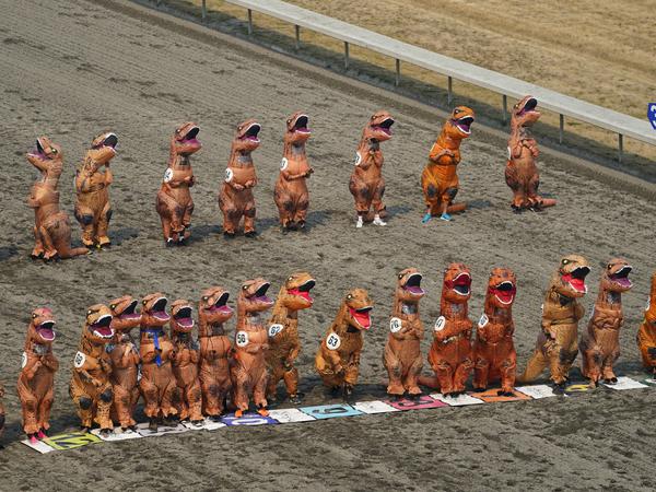 Sprint in Dino-Kostümen: Mehr als 200 Menschen nehmen an kuriosem Wettrennen teil