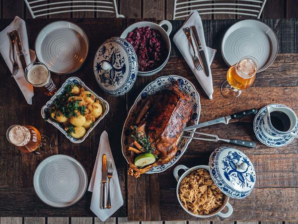 Lieber ein Menü? Das liefert etwa das Team vom „Brlo“ um Ben Pommer. Vorneweg gibt’s eine Schwarzwurzelsuppe mit Trüffel, dann eine Ente aus Brandenburger Freilandhaltung mit Johannisbeer-Rotkohl, Kartoffel-Nussbutter-Klößen, Berliner Weiße- Kraut und einer kräftigen Entenjus. Zum Finale dann einen Pecan Pie mit Sauce Anglaise. Die Getränkebegleitung: 1 Liter Glühbier und vier Brlo-Biere. Die Entenbox kostet 199 Euro plus 30 Euro Pfand. Sie macht vier bis fünf Personen satt und ist unter brwhouse@brlo.de bestellbar. Eine vegetarische Variante hat das Küchenteam auch bereit, sind ja ausgewiesene Gemüseexperten im Brwhouse am Werk. Einfach nachfragen.