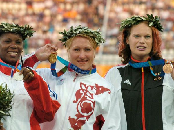 Irina Korscharenko (Mitte) war 2004 gedopt, Kleinerts Bronzemedaille wurde zu Silber, Yumileidi Cumba (l.) aus Kuba wurde nachträglich Olympiasiegerin.