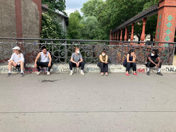 Vor diesem dynamischen gemeinsamen Site-Specific Parcours von der Badbrücke bis zum Vorplatz der Bibliothek haben sich Nuria Carrillo Erra, Hana Stojakovic, Sophia Obermeyer. Safete Muchave, Lucas Godoi Sene, Altınay Kapsız. Mahshad Rezai, Studierende im zweiten Semester des Bachelorstudiengangs „Tanz, Kontext, Choreografie“ am HZT Berlin in Videomeetings getroffen.