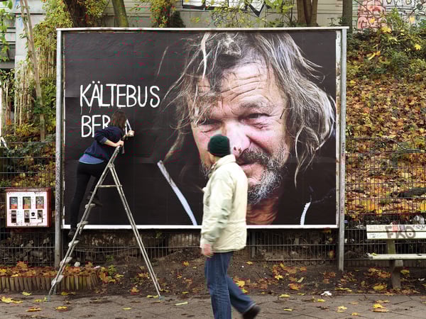 Seit acht Jahren gibt der Berliner Künstler am Stuttgarter Platz Initiativen Sichtbarkeit, die sich für eine bessere Welt einsetzen. Und nimmt dafür keinen Cent.