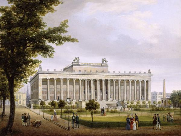 Und so entstand das wahrscheinlich erste Museum weltweit, das von Anfang an als Kunstmuseum konzipiert und nicht – wie Louvre oder British Museum – architektonisch Teil eines Königsschlosses gewesen war. Wilhelm von Humboldt leitete die zuständige Kommission, der damals 44-jährige Karl Friedrich Schinkel wurde als Architekt berufen; er hatte zuvor die großen Museen in London und Paris studiert. Seine Pläne vervollständigten den Lustgarten als zentralen Ort des Berliner Selbstverständnisses: Politik (Schloss) im Süden, Religion (Dom) im Osten, Militär (Zeughaus) im Westen und jetzt die Kunst im Norden.