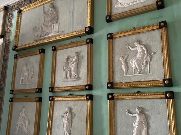 Der Saal im Obergeschoss mit seinen kostbaren Böden und Verkleidungen aus einer Vielzahl heimischer Hölzer wurde für Empfänge, Diners und Konzerte genutzt, unten im Empfangs- oder auch „Teeraum“ zierten Reliefs mit antiken mythologischen Motiven die Wände.