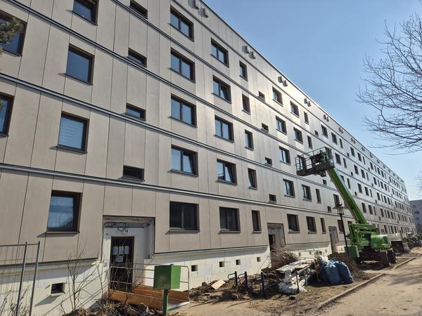Für die Mieter bedeutet dies, dass ihre durchschnittliche Kaltmiete von 5,66 Euro um zwei Euro pro Quadratmeter auf 7,66 Euro steigt. Gleichzeitig rechnet die an der Sanierung beteiligte Ingenieurgesellschaft BBP Bauconsulting aus Berlin damit, dass der Energiebedarf in dem 1982 errichteten fünfstöckigen Gebäudekomplex um mehr als 40 Prozent zurückgehen wird. Laut dem Berliner Unternehmen ecoworks, nach eigenen Angaben Pionier bei der seriellen Sanierung in Deutschland, sinken die jährlichen Heizkosten pro Wohnung im Schnitt um 500 Euro.