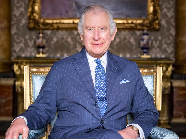 Dabei sitzt Charles, im blauen Anzug und mit blauer Krawatte, in einem Polstersessel aus vergoldetem Holz und Seide von 1828. Zwölf dieser Stühle waren König George IV. einst für die Einrichtung von Schloss Windsor geliefert worden.