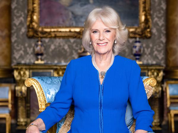 Camilla, in einem blauen Kleid und mit Perlen-Ohrringen ihrer Schwiegermutter Queen Elizabeth II., nahm in einem Bergère genannten Sessel aus vergoldetem Holz und Seide Platz. Das Sitzmöbel stamme aus der Zeit um 1812 und sei wahrscheinlich von George IV. für das Carlton House in Auftrag gegeben wurden, hieß es weiter.